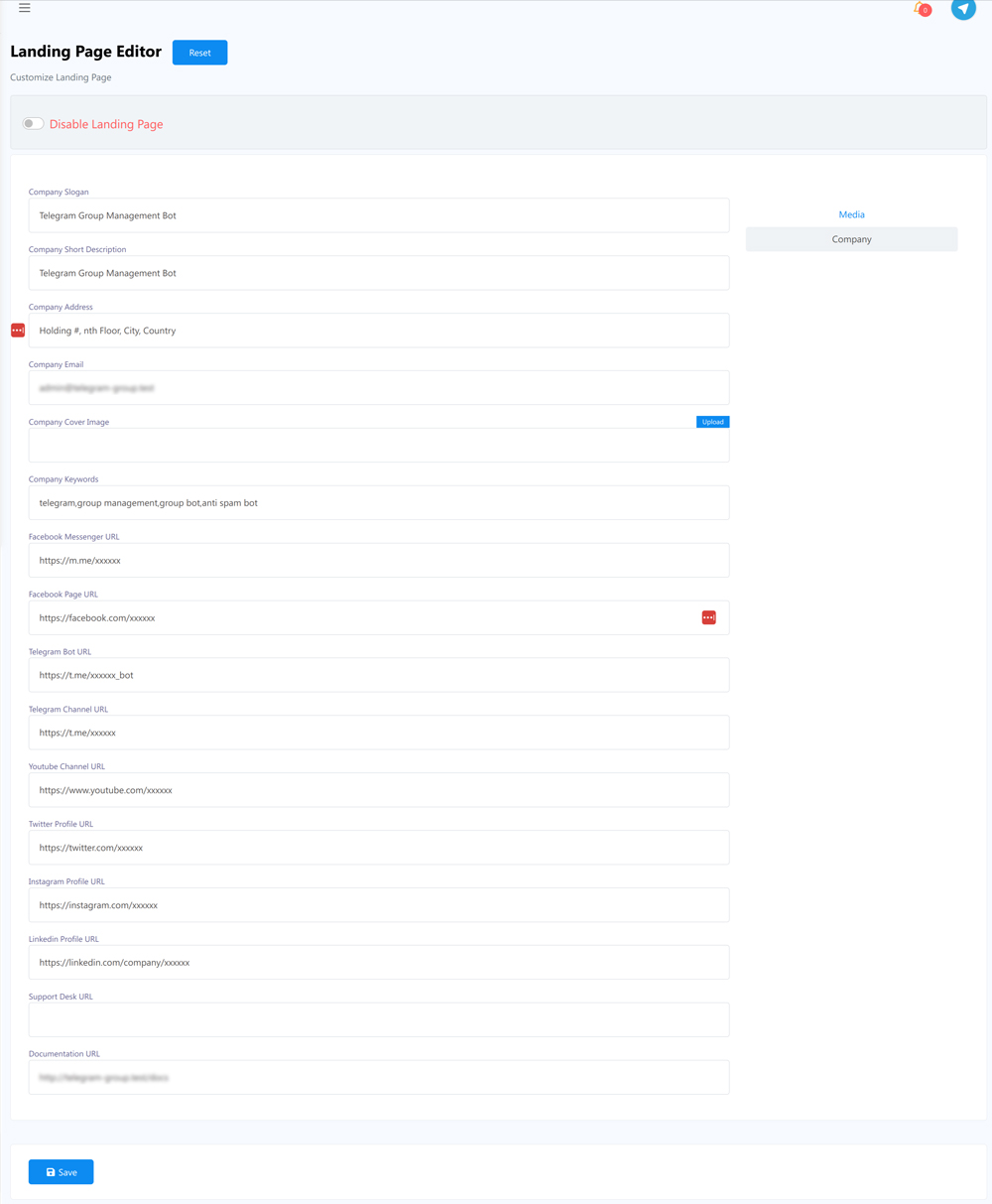 This page allows you to customize your company information and optimize your SEO meta data. You can also replace existing media on your landing page and display customer reviews to increase engagement. Use can use `Language Editor` to change landing page content which will be discussed later in this article.