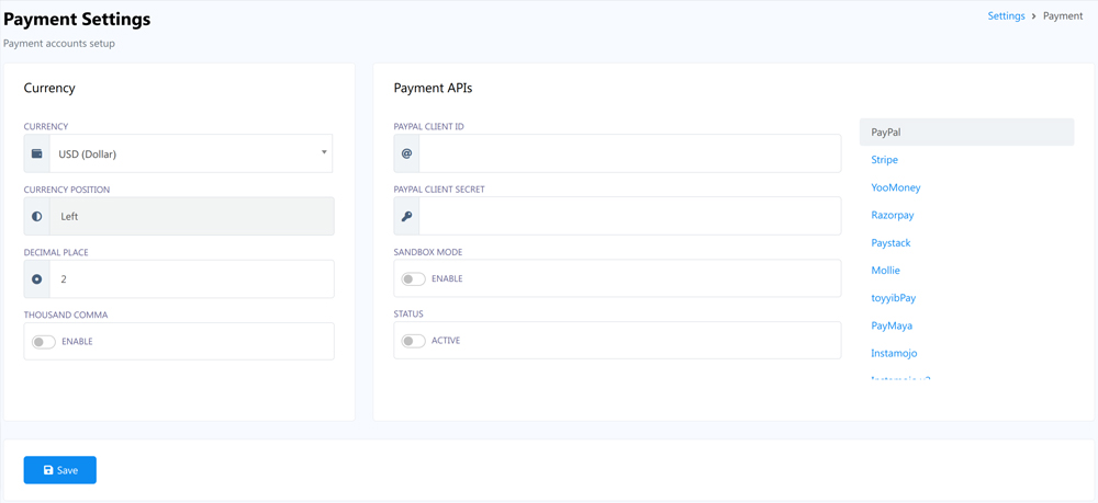 We curretly support different payment methods including PayPal, Stripe, YooMoney, RazorPay, PayStack, Mollie, ToyyibPay, PayMaya, InstaMojo, Xendit, MyFatoorah etc. Add the payment method you want to use and setup the currency and save.