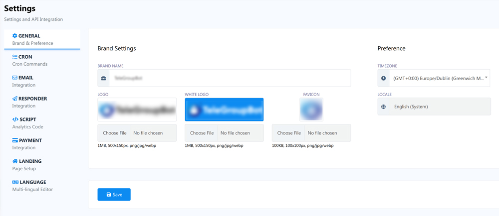 Set your brand name,logo, favicon and preference (locale,timezone)
